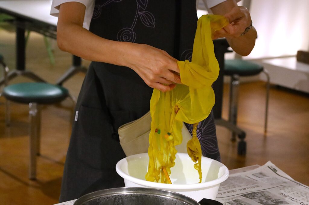 ビー玉やゴムなどを使って簡単な絞り模様をほどこし、植物を染料に用いてスカーフを染め上げます。